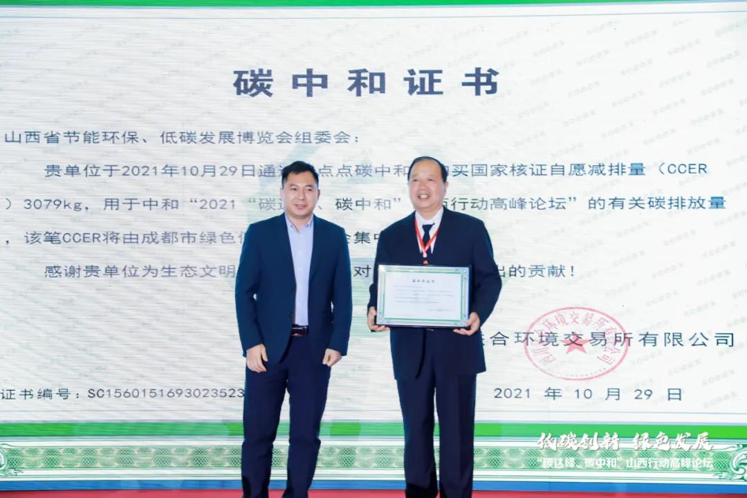 祥睿能源作為會議協(xié)辦單位,結(jié)合會議“低碳創(chuàng)新·綠色發(fā)展”的主題,聯(lián)合主辦方打造成了名副其實的山西首次碳中和博覽會,即將本次會議執(zhí)行過程中產(chǎn)生的二氧化碳排放量,通過購買 CCER實現(xiàn)了碳減排的抵消。同時,在現(xiàn)場授予了大會組委會《碳中和證書》,由省節(jié)能協(xié)會會長藺建國代表組委會領(lǐng)取了該項證書。